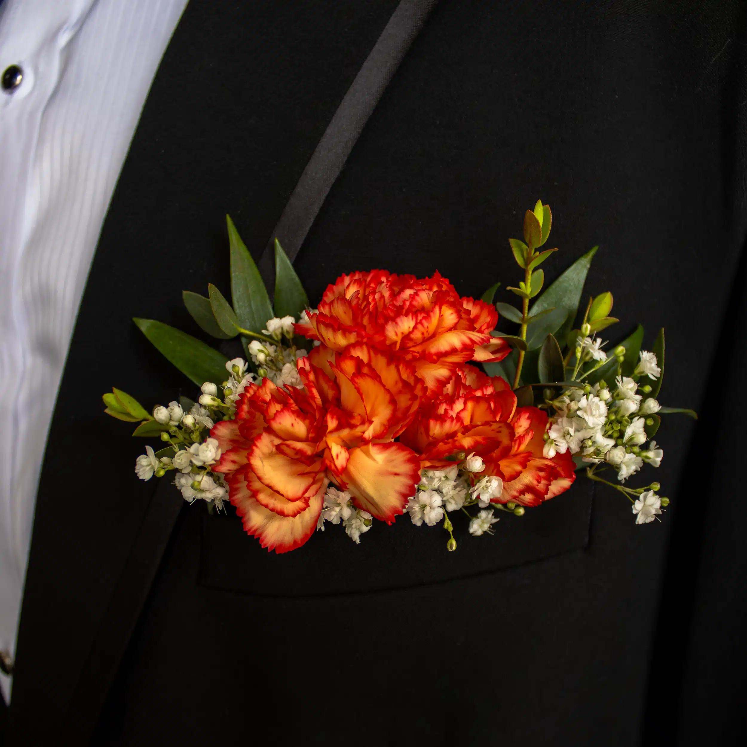 A boutonniere that slides into a jacket pocket is a modern take on the traditional boutonniere, offering a sleek and sophisticated alternative. Rather than being pinned directly onto the lapel, this style is designed with a small, decorative attachment that fits neatly into the pocket of a suit or tuxedo.