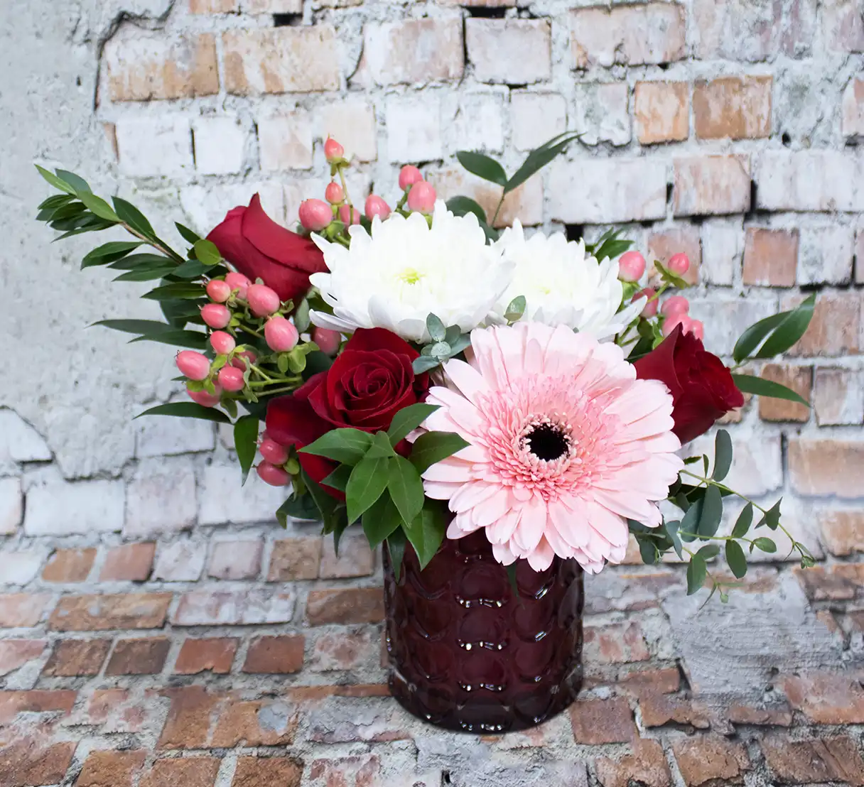 Make a lasting impression this Valentine’s Day with a floral arrangement that blends classic romance and vibrant charm. Featuring cheerful gerbera daisies, timeless roses, and rich hypericum berries, this bouquet offers beautiful contrast and depth. Each bloom is artfully arranged in a red ornate glass vase, adding elegance and sparkle to the design. Perfect for Valentine’s Day, anniversaries, or romantic surprises, this arrangement delivers heartfelt emotion, striking color, and unforgettable beauty in a keepsake presentation they’ll treasure long after the flowers fade.