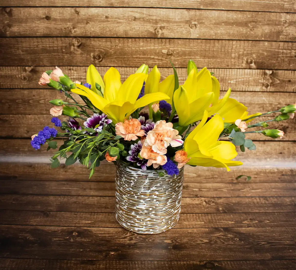A charming floral bouquet featuring bold asiatic lilies, cheerful daisies, and delicate mini carnations, beautifully arranged in a decorative mosaic vase. This thoughtfully designed arrangement blends vibrant color, soft texture, and artistic detail for a fresh and uplifting presentation. The asiatic lilies provide elegant height and striking blooms, while daisies add a lighthearted, classic touch. Mini carnations bring fullness and lasting beauty, enhancing the bouquet’s overall balance. The mosaic vase adds a handcrafted, artistic flair with its colorful, reflective pattern, making it perfect for gifting, celebrations, or home décor. A versatile design that delivers beauty, joy, and timeless floral appeal today.