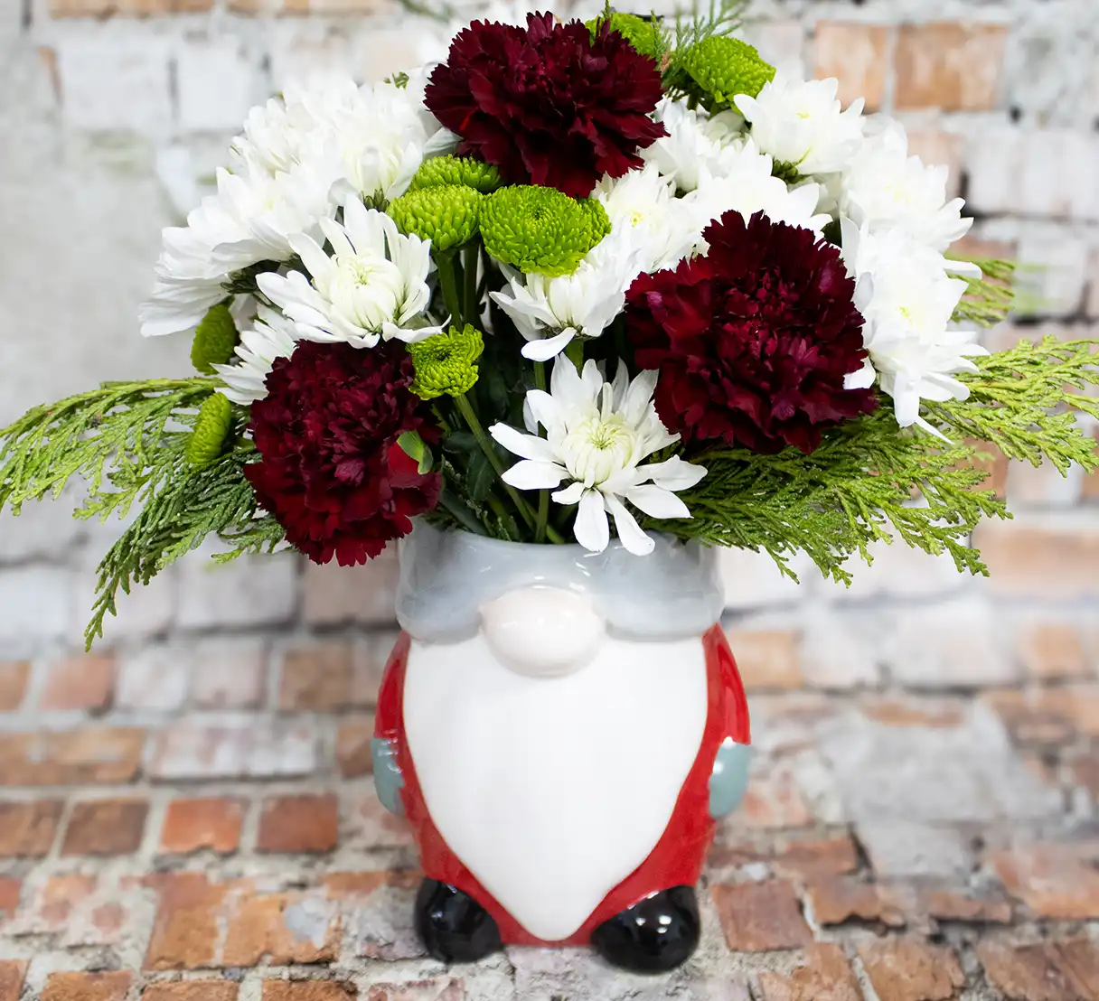 Add festive charm to your holiday décor with this delightful red and white carnation bouquet, arranged in a whimsical ceramic gnome vase. The vibrant red and crisp white carnations create a cheerful, seasonal display, perfectly balanced for a playful yet elegant look. The gnome-shaped vase adds personality and holiday fun, making this bouquet a standout centerpiece for Christmas tables, mantelpieces, or winter gatherings. Ideal as a thoughtful gift, it brings joy and festive spirit to any recipient. With its combination of classic holiday blooms and a charming gnome vessel, this arrangement captures warmth, cheer, and seasonal delight.