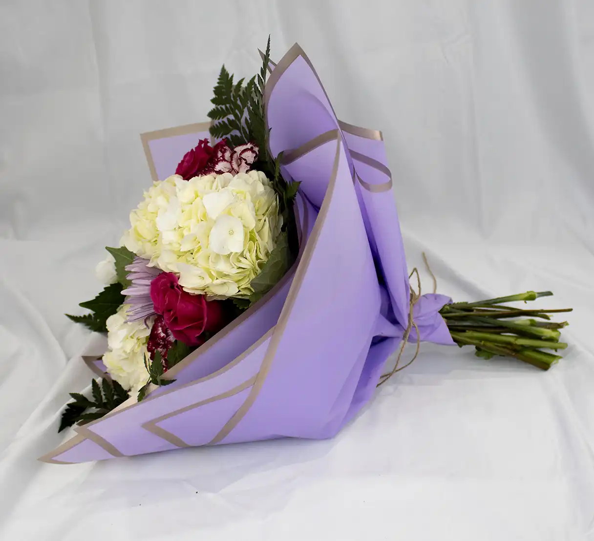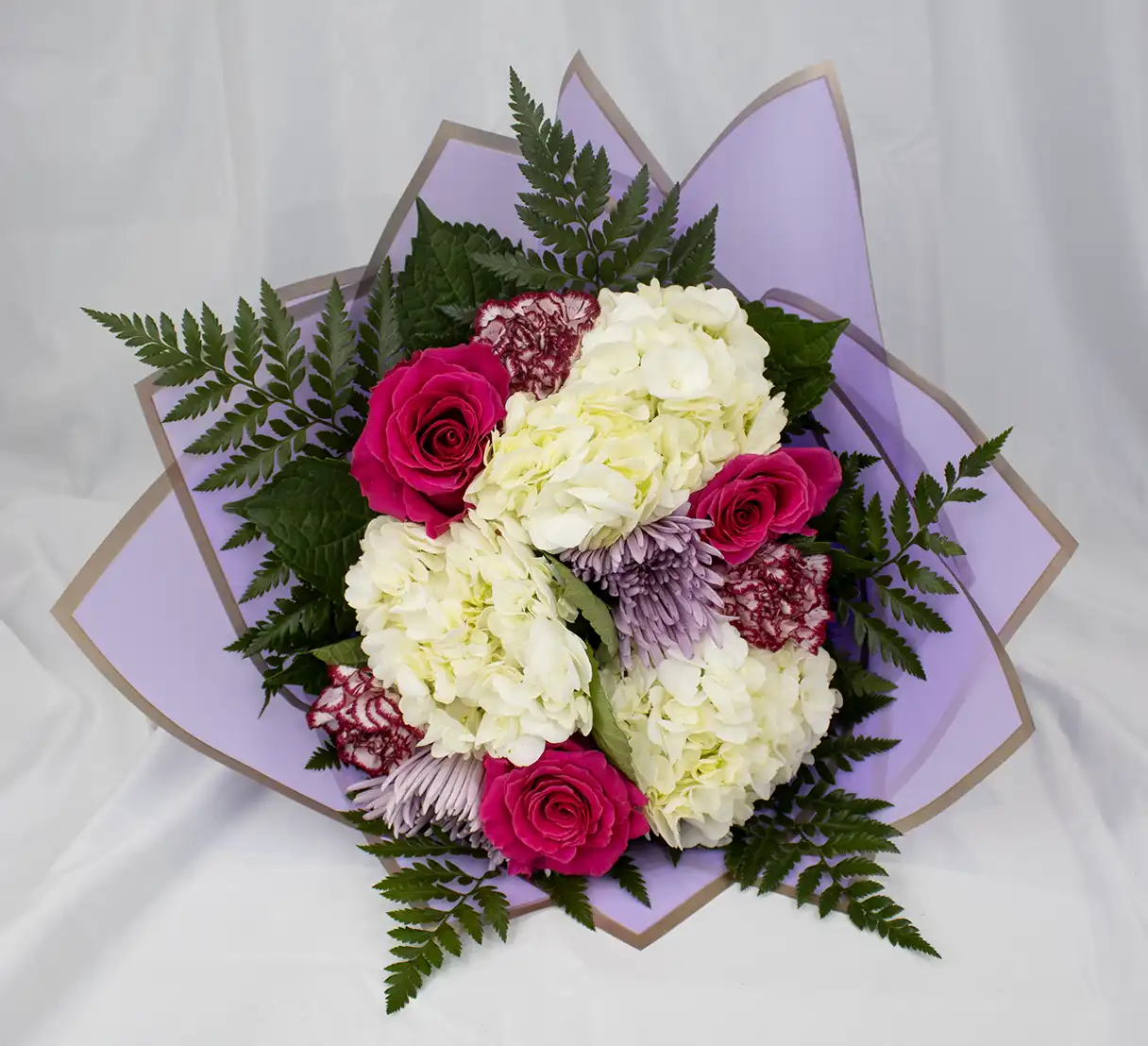 This elegant tissue-wrapped bouquet features soft shades of white, pink, and lavender. Lush hydrangeas form a full base, while roses add classic beauty. Spider mums bring unique texture with their delicate petals, and ruffled carnations complete the arrangement. Light, graceful, and romantic, it’s perfect for sharing a thoughtful sentiment.