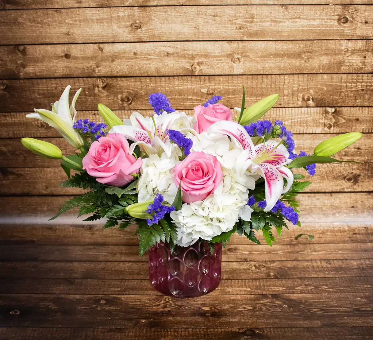 A luxurious floral bouquet featuring fragrant stargazer lilies, elegant roses, and lush hydrangea, beautifully arranged in a decorative pink glass vase. This stunning design blends bold fragrance with soft, romantic textures for a truly captivating presentation. The stargazer lilies offer a sweet, intoxicating aroma and striking star-shaped blooms, while roses bring timeless beauty and grace. Hydrangea adds fullness and airy elegance, creating a balanced and abundant composition. The decorative pink glass vase enhances the arrangement with a soft, feminine glow, making it perfect for special occasions, celebrations, or thoughtful gifting. A refined bouquet that delivers beauty, fragrance, and lasting impression.