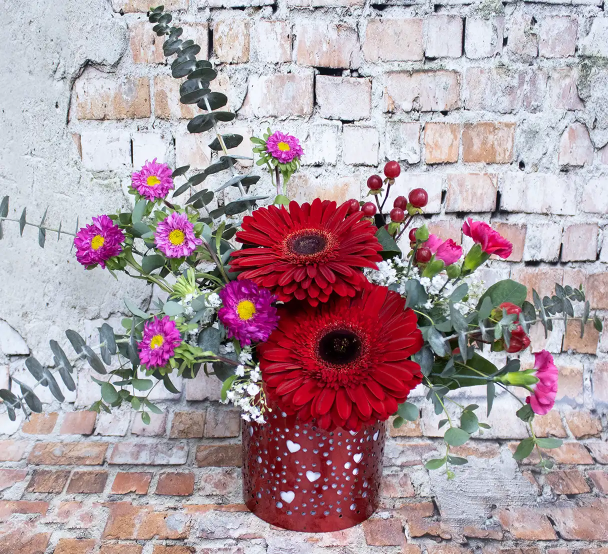 Bright and cheerful, this Valentine’s Day floral arrangement features vibrant gerbera daisies, delicate mini carnations, and fresh eucalyptus. Arranged in a charming red metal heart vase, this bouquet blends playful romance with natural beauty, making it a perfect way to share love, joy, and heartfelt smiles.
